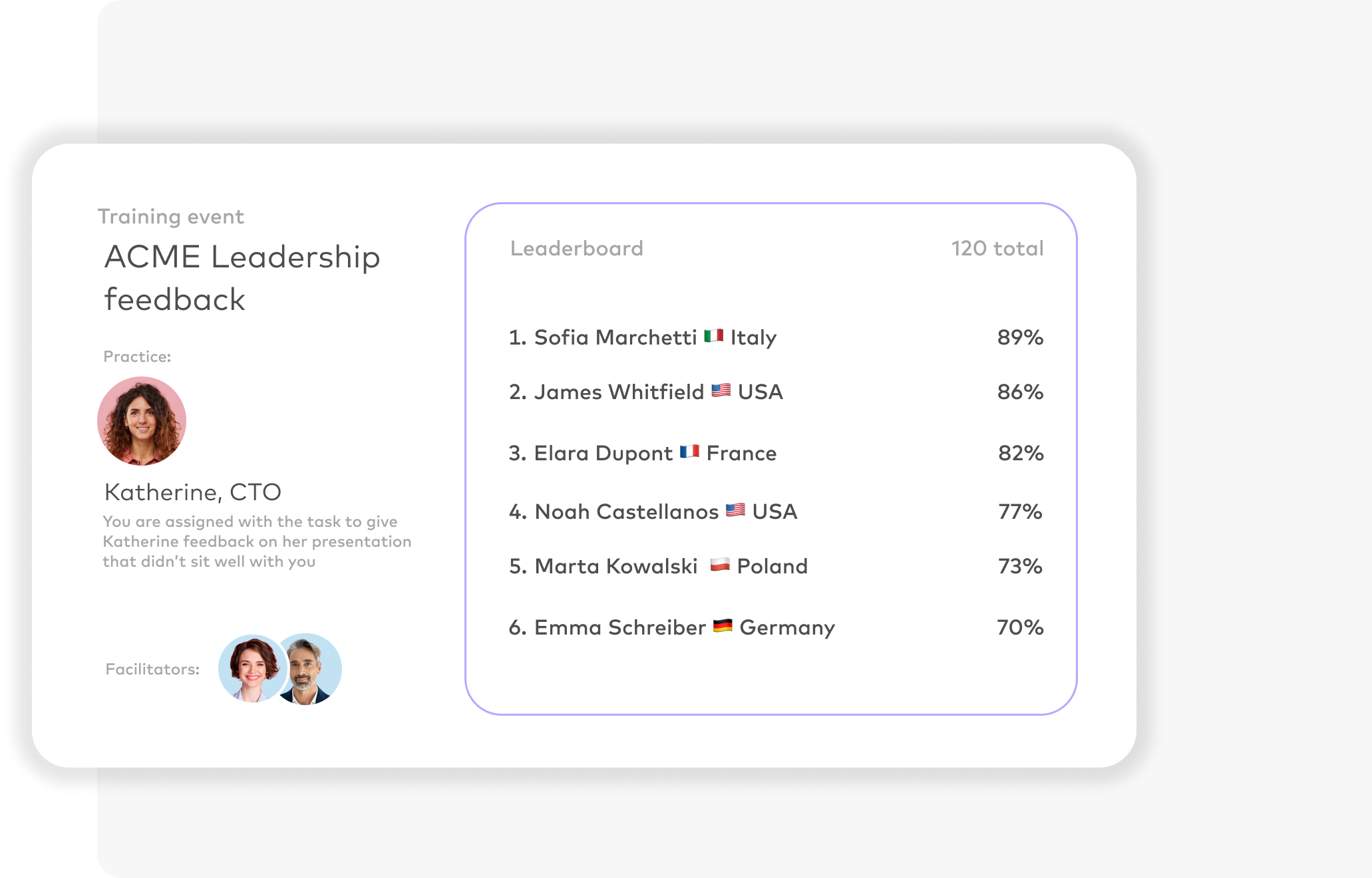 Leaders practiced feedback conversations at global scale with actionable insights by region/cohort.